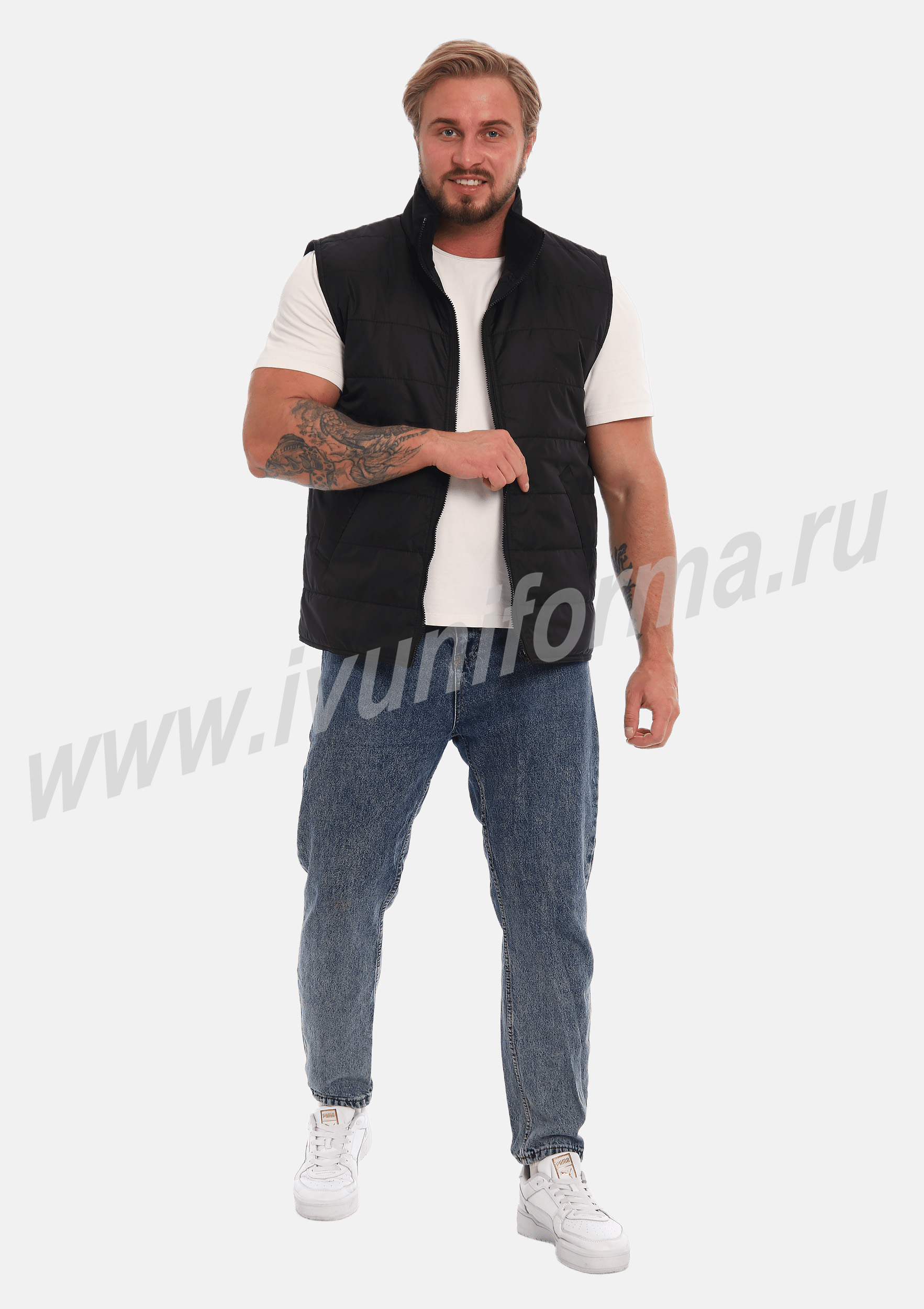 Жилет утепленный на молнии с двумя боковыми карманами в нижней части. Внутренняя часть жилета выполнена из ткани флис. В качестве утеплителя используется синтепон. Жилет является универсальным для использования как мужчинам, так и женщинам.